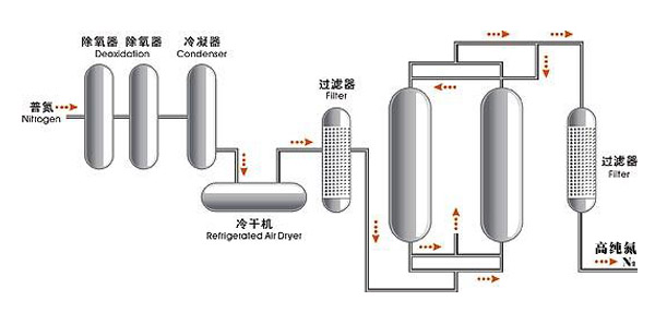 氮?dú)饧兓b置是以變壓吸附制得的粗氮為原料,經(jīng)加氫催化除氧,冷凝水吸附兩級(jí)干燥除塵,去除氮?dú)庵械难酢⑺蛪m埃等雜質(zhì),從而獲得高純度的氮?dú)狻F淙丝诘拇值兌纫?ge;98%,出口精氮的純度≥99.999%,氧含量≤3μm,露點(diǎn)≤-65℃。